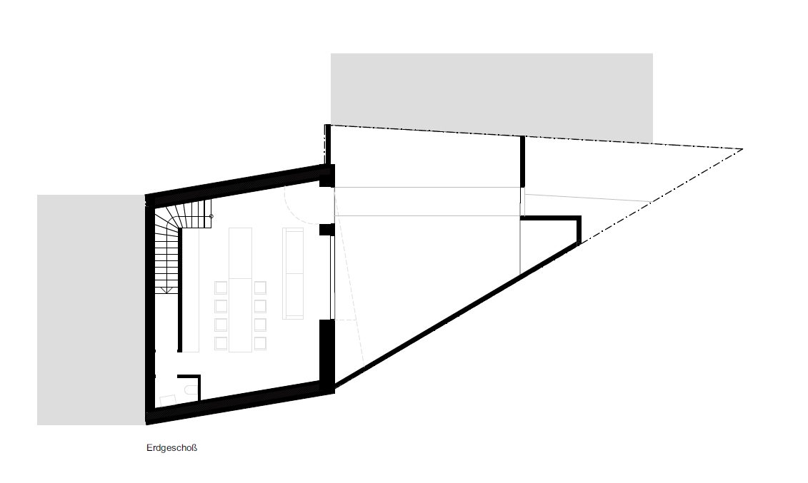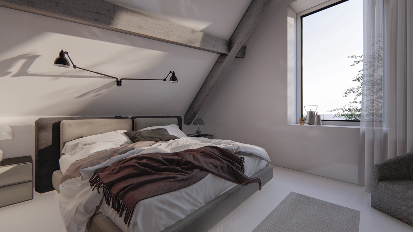 Der Grundriss war herausfordernd, ist aber im Endeffekt perfekt auf die Bedürfnisse angepasst worden. Ein offener Wohnraum im Erdgeschoß besticht durch sehr viel natürliches Licht und Gemütlichkeit. Bad und Schlafzimmer sind im Obergeschoß angesiedelt.